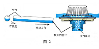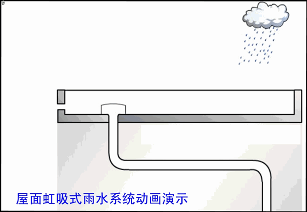 傳統(tǒng)重力式雨水系統(tǒng),是由雨水斗和垂直落水管網(wǎng)組成的。雨水斗收集的雨水通過垂直落水管排至地下排水管網(wǎng)中。為保證雨水順利流至排水管網(wǎng),這種傳統(tǒng)重力式雨水系統(tǒng)結(jié)構(gòu)所需的排水管管徑往往比較大,且與其相連的地下管網(wǎng)的管徑也比較大。這主要是由于系統(tǒng)內(nèi)處于恒定的大氣壓力(見圖2) ,雨水只靠垂直管道水落差產(chǎn)生的動力和水平管道的坡度流動。順著垂直落水管像瀑布一樣下流的雨水在水平管道內(nèi)產(chǎn)生翻騰(見圖2) ,這樣即便是在最大降雨量的情況下,水平管內(nèi)也有超過橫截面積1/2的空間充滿了空氣。也就是說,若能排除空氣,相同的水量只需傳統(tǒng)重力式雨水系統(tǒng)1/2的管道截面積就能排出。由于傳統(tǒng)重力式雨水系統(tǒng)無法除去空氣,提高其排水能力受到很大的限制。加之其流速低,雨水中夾帶的固體顆粒物容易在水平管道中沉積。這種雨水系統(tǒng)的低效率是由其結(jié)構(gòu)造成的,特別是安裝在大跨度的建筑屋面上,上述的缺陷顯得更為突出。